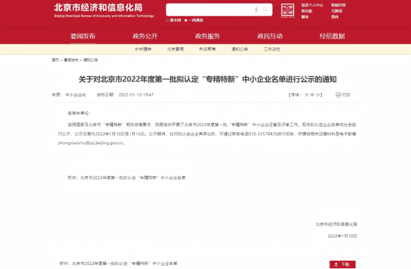 近日,北京市經(jīng)濟(jì)和信息化局正式公布了2022年度第一批“專精特新”中小企業(yè)名單。