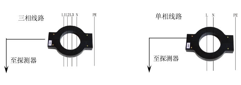 如下圖所示,將互感器套在被測線纜上,對于三相線路 L1、L2、L3 及 N 相線要同時穿過剩余電流互感器內(nèi)徑,對于單相線路 L 及 N 相線要同時穿過剩余電流互感器內(nèi)徑。剩余電流探測器的 ZT 量即是被測線路的剩余電流值,俗稱漏電值。