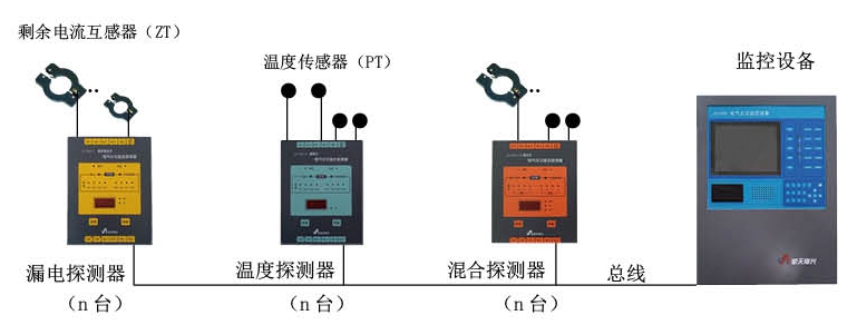 電氣火災(zāi)監(jiān)控設(shè)備安裝在值班室,以總線方式與多臺監(jiān)控探測器相連,接受各監(jiān)控探測器發(fā)送的漏電、溫度報警信息構(gòu)成分散監(jiān)測集中報警的電氣火災(zāi)監(jiān)控系統(tǒng)。