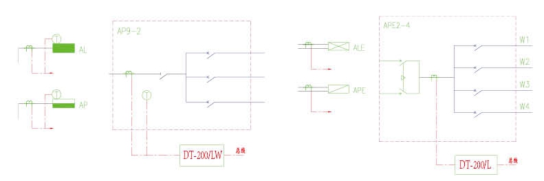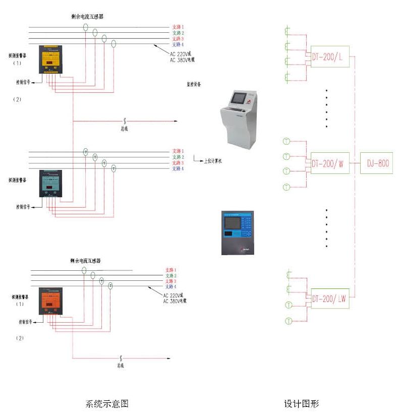 例:N 臺 DT-200/L 或 DT-200/W 或 DT-200/LW 電氣火災(zāi)監(jiān)控探測器與 DJ-800 電氣火災(zāi)監(jiān)控設(shè)備最多構(gòu)成 3760 路分散監(jiān)測所在線路剩余電流值、溫度值集中報警的電氣火災(zāi)監(jiān)控系統(tǒng)。