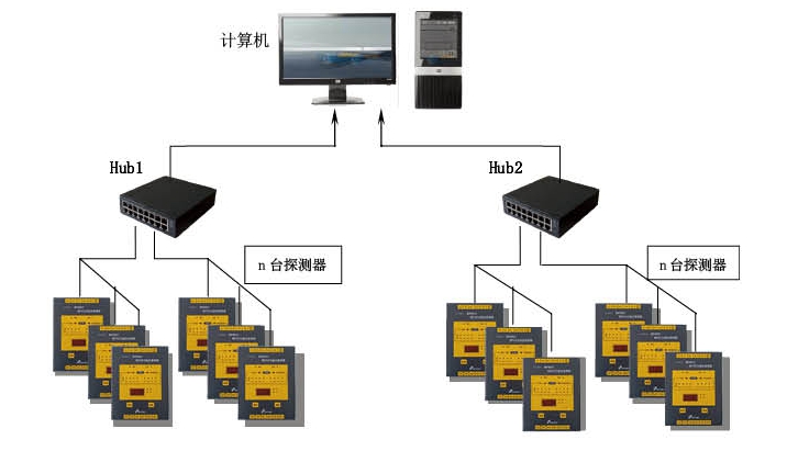 對于有多個變電室的大型用電單位,可設(shè)置多個電氣火災(zāi)監(jiān)控子電氣火災(zāi)監(jiān)控支路,系統(tǒng)的 Hub 集線器把報警信號傳給總值班室的計算機,構(gòu)成計算機集中監(jiān)測的集散管理系統(tǒng)。如下圖所示: